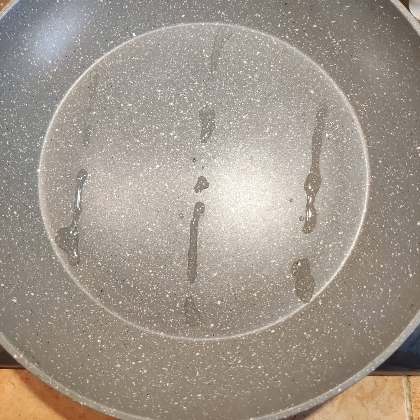 - Puis tracez deux autres traits parallèles au premier vers les bords droite et gauche de la poêle en mouillant plusieurs fois votre doigt pour chacun des traits comme sur la photo de ma poêle antiadhésive ci-dessous :