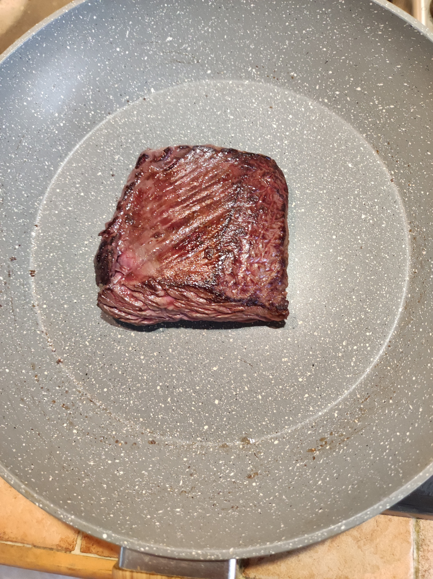 Vous pouvez arrêter le feu et servir la viande à moins que vous ne la préfériez plus cuite. Une fois la viande retirée de la poêle posez la poêle sur le feu éteint :