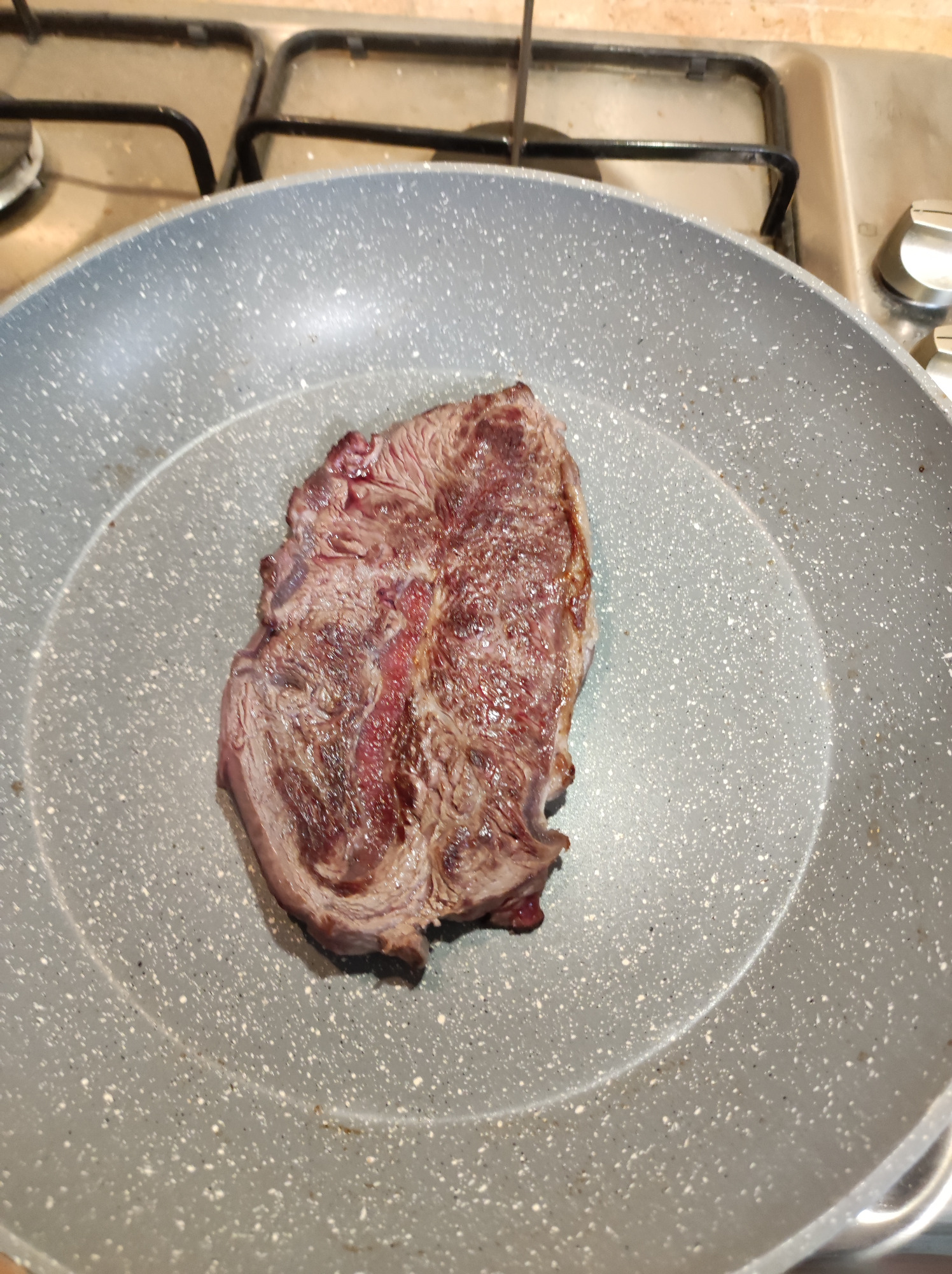 - Allumez le feu sous la poêle en le mettant à plein feu. Quand l'eau s'est évaporée au centre de la poêle baisser le feu d'un quart et attendez que 'eau se soit évaporée complètement ce qui indique que la poêle est à bonne température sur toute sa surface et que vous pouvez y mettre la viande à cuire sur sa première face.